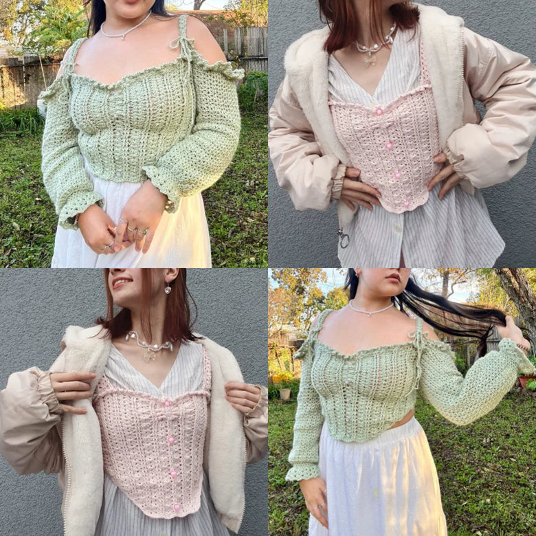 [BY PURCHASING, YOU AGREE THAT YOU WILL RECEIVE ONLY THE WRITTEN PATTERN] MIRANE is a made to measure pattern written in US terminology, suitable for advanced beginners and up! The pattern is designed and written by a right-handed crochet artist. Step by step guide are included in the pattern on how to recreate the design. Video tutorials are also provided in some specific parts. Materials: ✧ Size 2 or 3 yarn. (You are free to use any other types of yarn that are good for wearables like corset preferably not the stretchy one.) ✧ 3.00 TO 4.00 mm hook ✧ Tape measure ✧ Stitch markers ✧ Scissor and darning needle ✧ Lace ribbon (approx. 2 meters) for back ties (optional) ✧ Gems or pearl buttons to decorate the bodice (optional)
