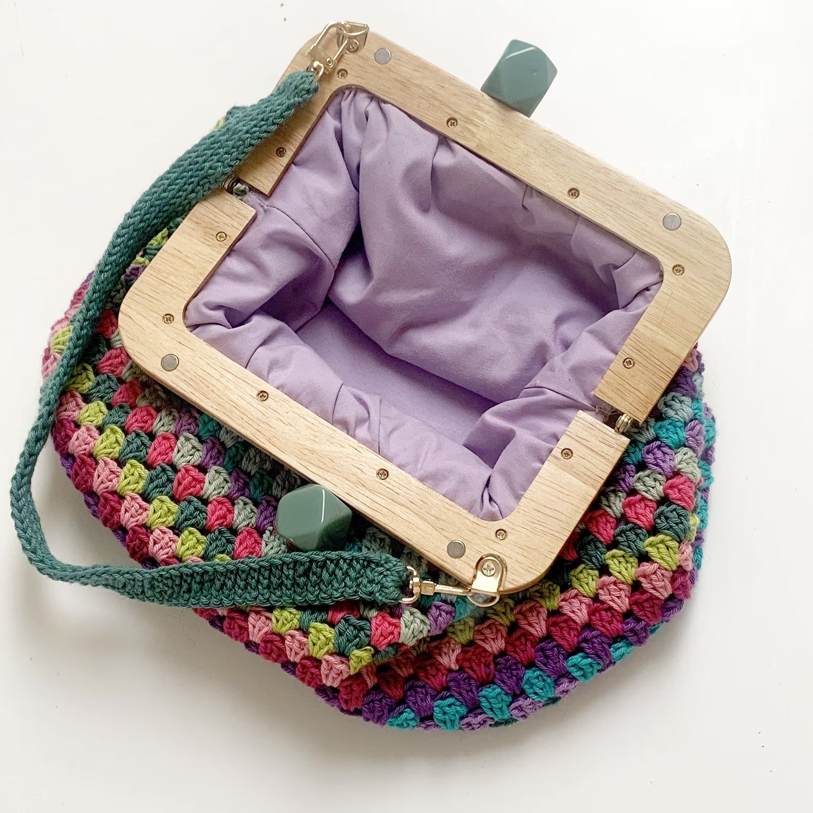The wooden purse frame adds an elegant touch.