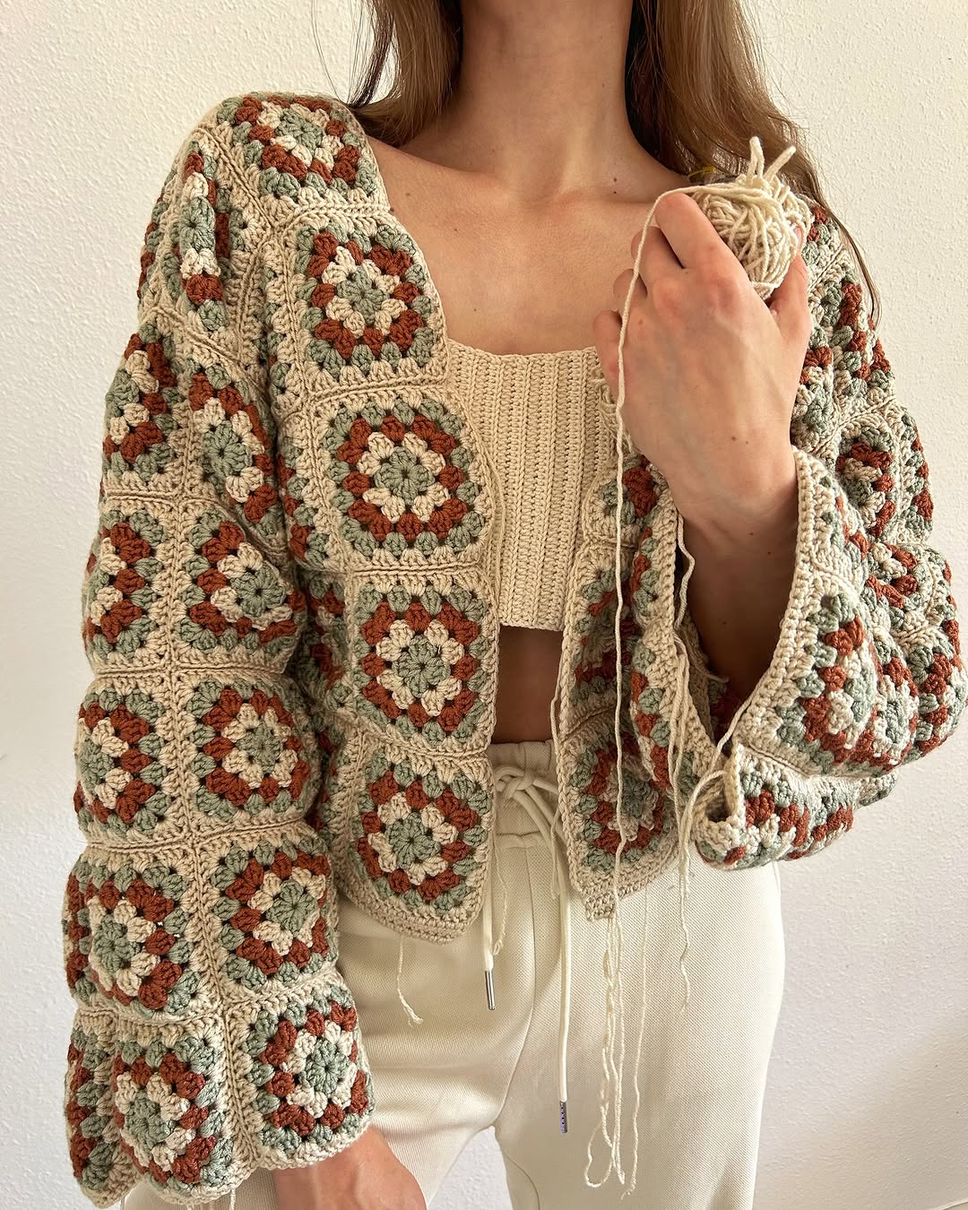 This cardigan is made by stitching squares together. All you need is some yarn and a bit of patience. It’s a labor-intensive process, but the result will make you happy!