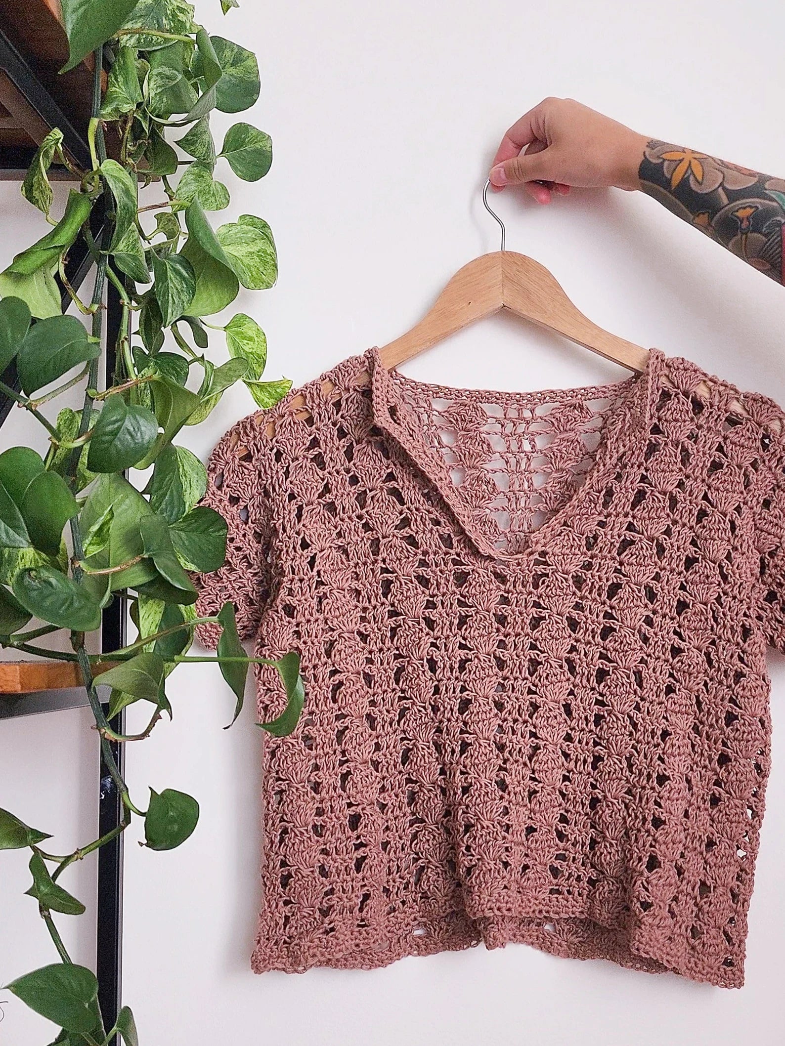 Effortless and breezy, this lacy collared blouse brought to you in collaboration with Hoooked Yarns is quick to work up and is perfect for summer days at the beach! Wear it over tank tops and bralettes, or even layer it with dresses- this shirt is also perfect as a swimsuit cover up! Experiment with different lengths for different looks.